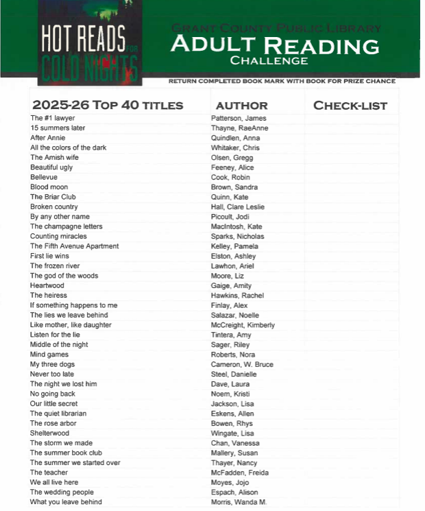The 2025-26 Adult Reading Challenge is underway! The shown list is composed of some of the most checked out books since January of 2024 to July of 2025. Participants are asked to read books from the list and complete a bookmark ballot before April of 2026 for each book read, giving it a 1 to 5-star rating. The bookmarks will serve as a registration slip for a drawing held at the conclusion of the program with the name drawn winning a $25 cash gift card. The participant reading the most of the listed titles will also be awarded a $25 cash gift card. From the ratings given we will determine the Grant County Public Library’s book of the year.